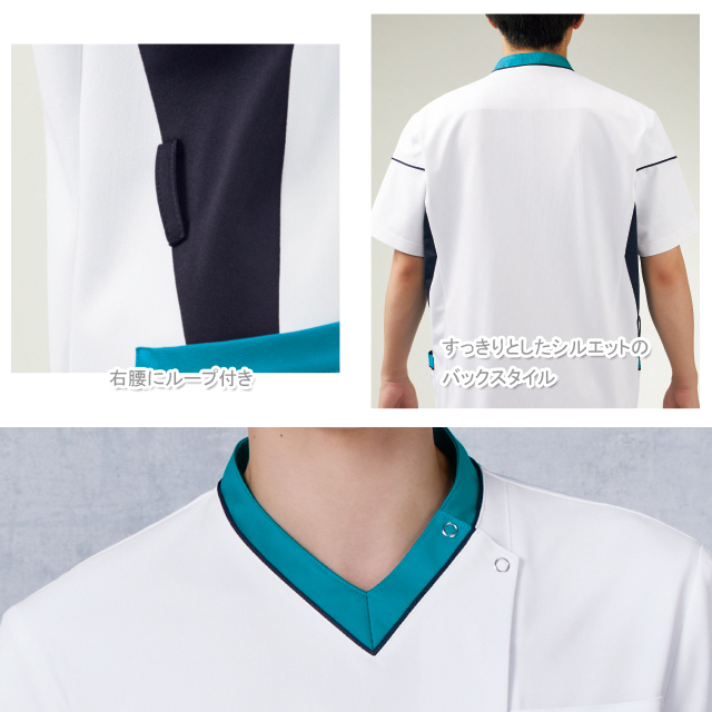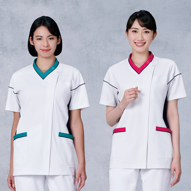 襟とポケット口の配色は、部署だけでなく、日勤と夜勤の区別など、様々な使い分けが可能です。