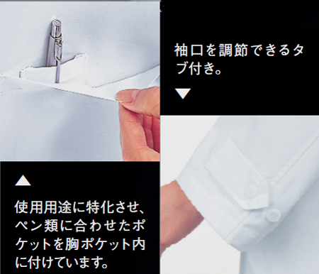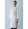 着心地と機能性に優れたベーシックな女性用ダブルタイプの診察衣。腰ポケットは、使いやすい斜めの箱ポケットにしました。作業性に優れ、すっきりとした印象を与えます。