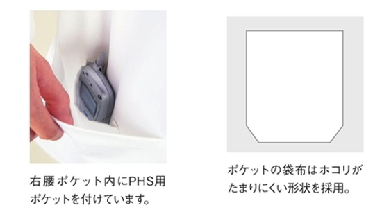 右腰ポケット内にPHS用ポケット付。ポケットの袋布はホコリがたまりにくい形状を採用。
