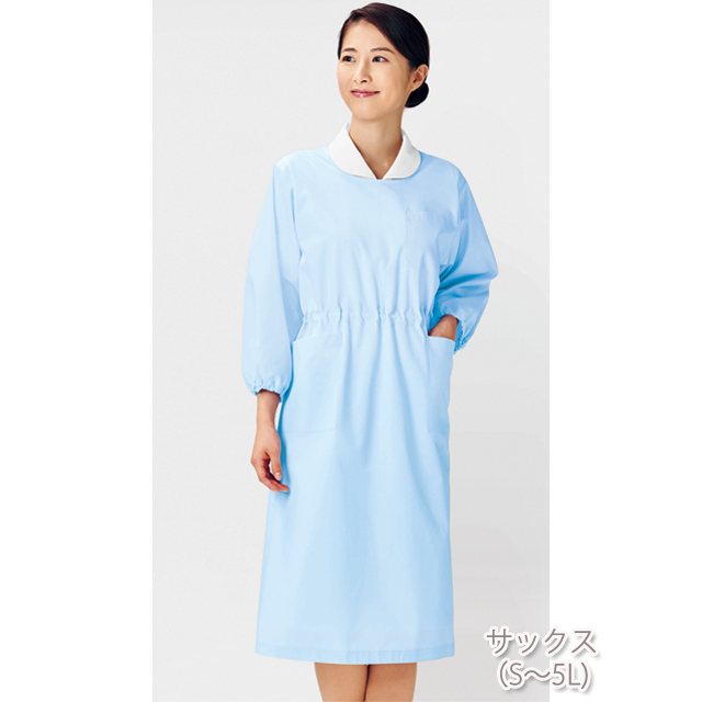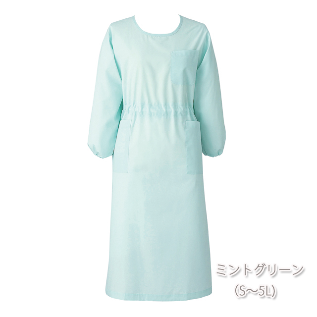 ウエストと袖口はヒモ入りで、自由にシルエットを調節できる七分袖予防衣。軽く通気性にも富んでいます。(袖口紐入り、ウエスト調節用の内紐入り)