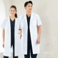 ポリエステルと肌触りの良い綿の生地で、ベーシックでオーソドックスなデザインの半袖ドクターコート(診察衣)です。