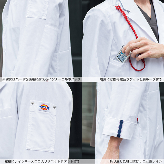 頑丈な素材でタフに使えるラフでカジュアルなデザインのDickies(ディッキーズ)メンズシングルコート。首元のデニム風の配色パイピングがアクセントのコートです。使用している生地は、制電機能の高密度の平織り素材。肌触りが良いので心地よく、ストレッチ性に優れているので毎日快適。頑丈な素材がハードな医療現場でもタフに使えます。収納に便利な複数のポケットや携帯電話のストラップをつけられる肩ループなど機能性も抜群。シンプルなデザインでありながらディッキーズらしさ溢れるディテールにもこだわった、1枚でかっこよくキマるメンズドクターコートです。