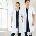 ポリエステルと肌触りの良い綿の生地で、ベーシックでオーソドックスなデザインの半袖ドクターコート(診察衣)です。