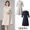 デコルテラインに配色を施したフレアスカートのおもてなし向けのワンピース。