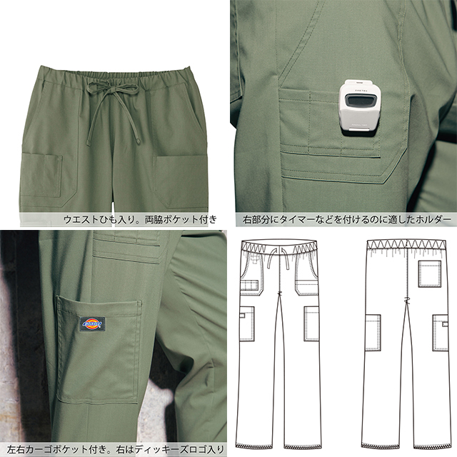ディッキーズとフォークが共同開発した、大人気ディッキーズシリーズの男女兼用カーゴパンツ。汗も吸い取りやすく、ナチュラルなストレッチを効かせたパルパー制電トロは、着こむほど、洗うほどに変化する、ダンガリー調の生地です。クリップタイマーを複数付けられる小分けポケットや、普通のカーゴパンツのように太もも部分にポケットを配置し、ちょっとした収納にも便利な仕様に。シンプルなデザインと豊富なカラーバリエーションで、さまざまな職種の方に着用いただけます。ディッキーズらしさ溢れるデザイン性と機能性で、毎日快適に、ラフに着こなせる男女兼用のディッキーズカーゴパンツです。