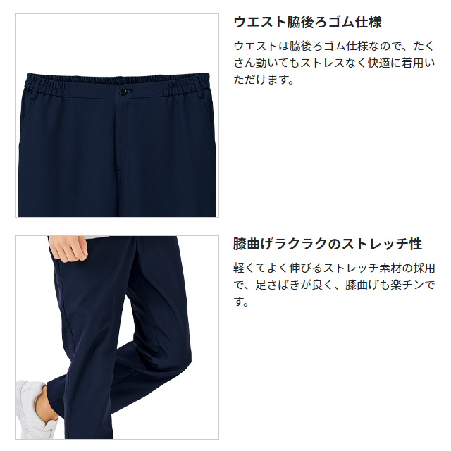 らくらくストレッチでスクラブにフィットする、男性用のスリムストレートパンツ。 高い伸縮性をもつポラリスストレッチ生地の採用で、従来のパンツと比べて、動きやすく、すっきりとしたシルエットが特徴。男性は女性に比べて骨格や肉付きの違いが大きく、体型も様々です。運動量を確保し、様々な体型の人に合うシルエットにしました。 適度なゆとり感でダボついていないので、きちんとして見えて清潔感のあるスクラブパンツ。ジップスクラブとのコーディネートにおすすめです。
