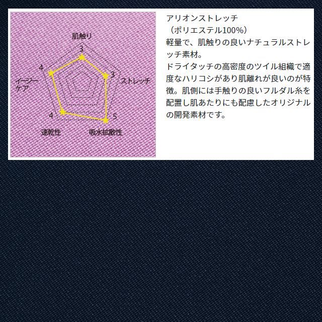 素材にはポリエステル100%のアリオンストレッチを使用。軽量で、肌触りの良いナチュラルストレッチ素材。ドライタッチの高密度のツイル組織で適度なハリコシがあり肌離れが良いのが特徴。肌側には手触りの良いフルダル糸を配置し肌あたりにも配慮したオリジナルの開発素材です。