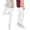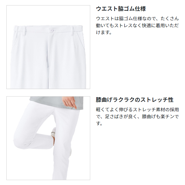 らくらくストレッチで美シルエットの女性用の細身のスリムテーパードパンツ。 裾に余分な生地の余りがなく、裾さばきが良いです。 伸縮性のあるポラリスストレッチ生地の採用で、女性らしいスリムなシルエットながら、ストレッチが効いているので動きやすく、腰回りとお尻の納まりが最高に履き心地の良いパンツに仕上げました。一日中履いていてもストレスなく快適に着用していただけます。ジップスクラブ、チュニックとのコーディネートにおすすめ! デザイン・機能性ともに女性に嬉しいスクラブパンツです。