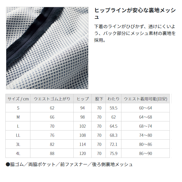 ●特徴:脇ゴム/両脇ポケット/前ファスナー/後ろ側裏地メッシュ