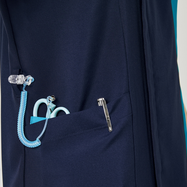 便利なループ付きの右腰の小分けポケットは、サージカルテープやはさみなど小物類の収納に。左腰にもポケット付き。