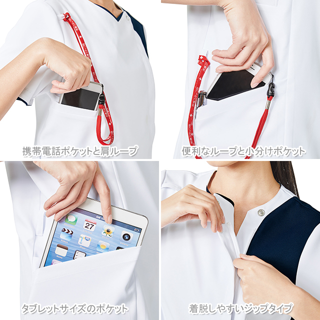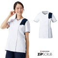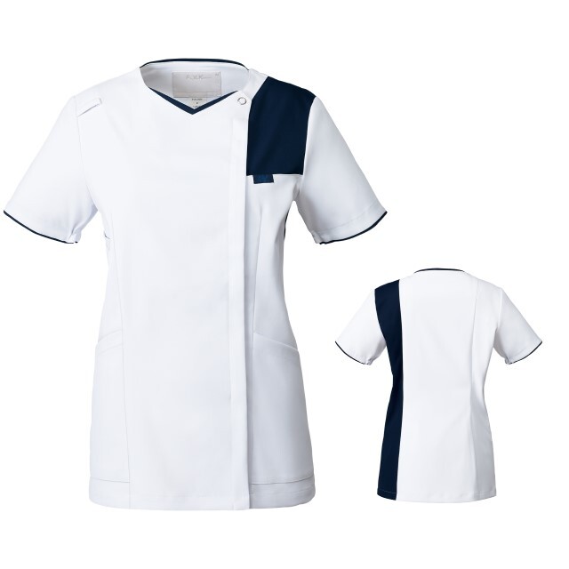 左胸から肩、背面へ続く配色が印象的なおしゃれな女性用スクラブです。