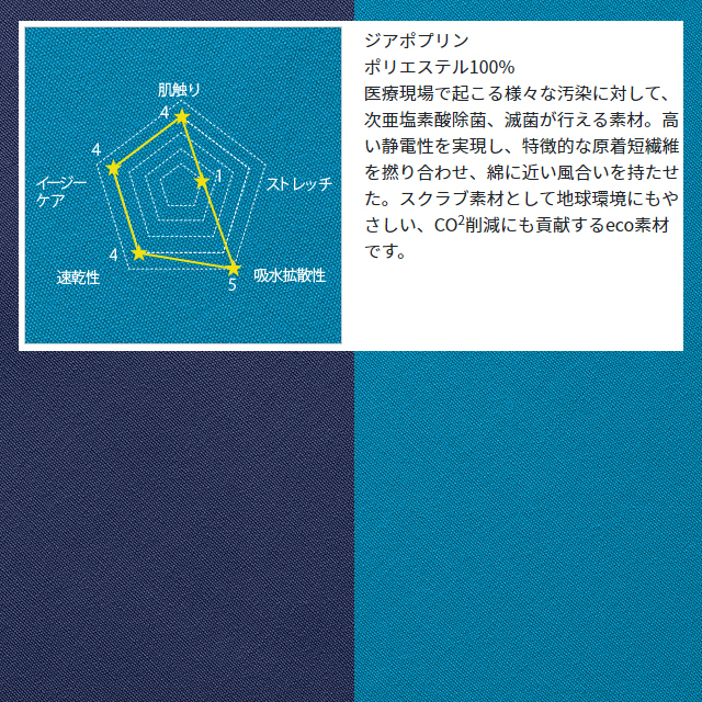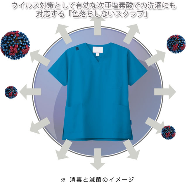 次亜塩素酸の消毒・滅菌の洗濯にも対応の色落ちしないスクラブ「ジア・スクラブ」が登場。