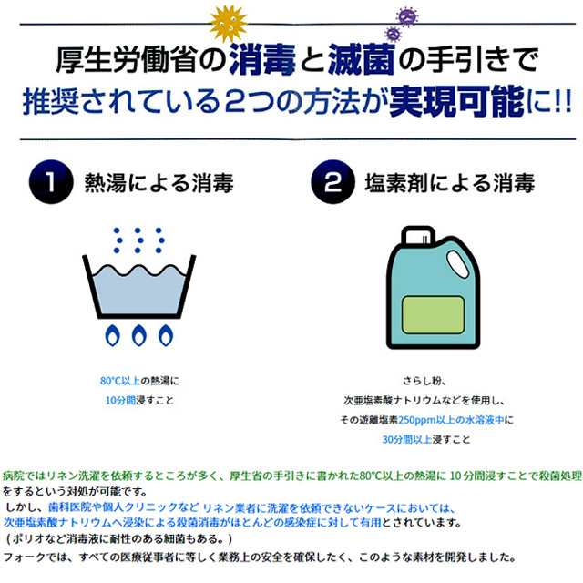 病院ではリネン洗濯を依頼するところが多く、厚生省の手引きに書かれた80℃ 10 分の熱水で殺菌処理をするという対処が可能です。が、歯科医院や個人クリニックなどリネン業者に洗濯を依頼できないケースにおいては、次亜塩素酸ナトリウムへ浸染による殺菌消毒がほとんどの感染症に対して有用とされています。( ポリオなど消毒液に耐性のある細菌もある。)