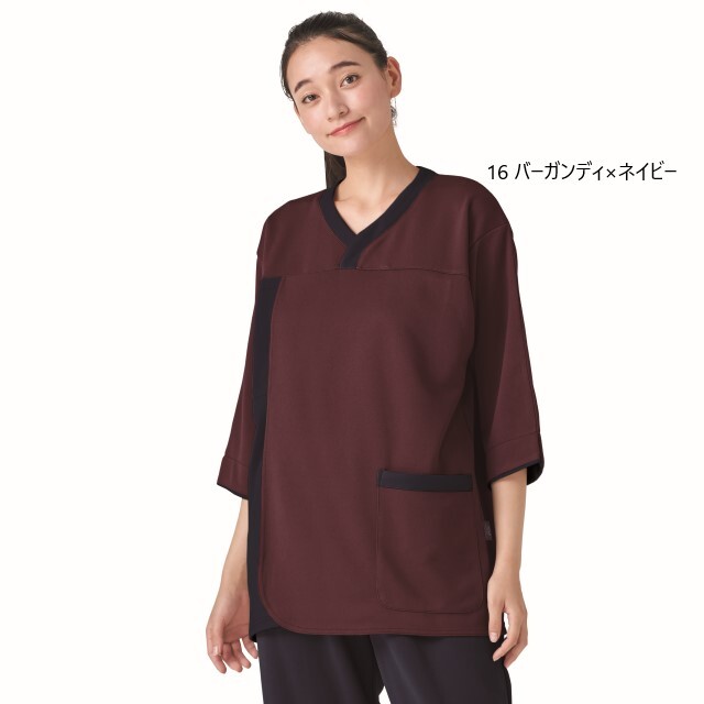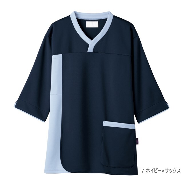 かぶりやすく開きすぎない襟元。落ち着いた配色なので様々なシーンに対応可能の検診衣です。