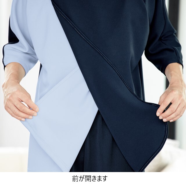 前が大きく開くので検診しやすいデザインです。腕まくりしやすいよう、袖口スリット入りです。