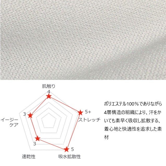 ポリエステル100%でありながら4層構造の組織により、汗をかいても素早く吸収し拡散する、着心地と快適性を追求した素材を使用しています。