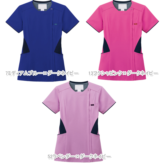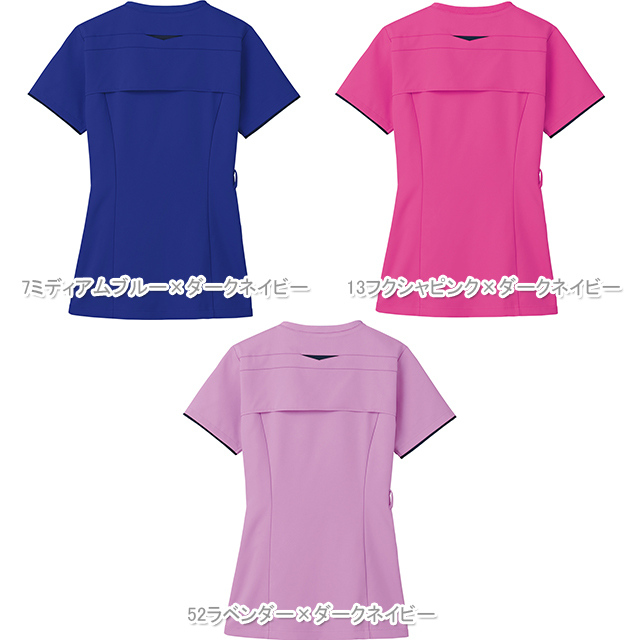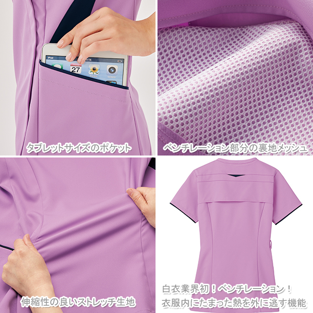 前身頃から後身頃にかけて、スポーティーなダークネイビー配色のラインをテープ状に配置することで、元気で健康的な印象に仕上げた、女性向けジップスクラブ。逆三角形のシルエットで、女性に嬉しい、ウエストのくびれを感じさせるデザインのスクラブです。 軽くて丈夫な素材のアリオンストレッチは、伸縮性のよいストレッチ生地で、動きやすさはもちろん、ポリエステル100%で、優れたイージーケア性も嬉しいポイント。 後身頃の構造を利用をして、ベンチレーション機能を追加。通気性のあるメッシュ生地を裏地に採用することで、空気が抜けるだけでなく、熱がこもらないので、空気循環を促してくれて、一日中着用していても、ストレスなく快適にお仕事していただけます。 また、着用時の首周りの快適さを考え、Vネックと後襟部分をリブ仕様にすることで、肌当たりを良くしたスクラブに。 グッドデザイン賞受賞のジップスクラブは、髪型の乱れやメイク崩れのストレスを解消した、「羽織って着られる」脱着のしやすさも高く評価されているスクラブです。