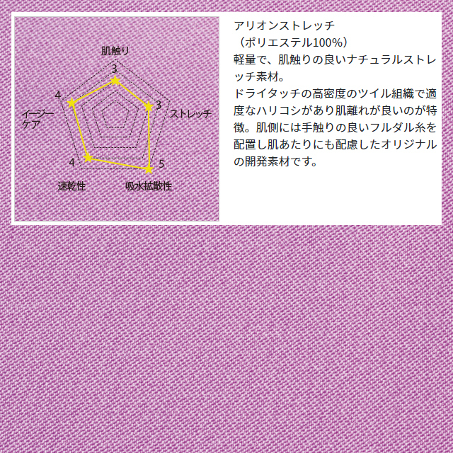 素材にはポリエステル100%のアリオンストレッチを使用。軽量で、肌触りの良いナチュラルストレッチ素材。ドライタッチの高密度のツイル組織で適度なハリコシがあり肌離れが良いのが特徴。肌側には手触りの良いフルダル糸を配置し肌あたりにも配慮したオリジナルの開発素材です。