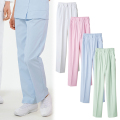 タテヨコで異なる糸を使った交織はとても丈夫で、耐久性があるのが特徴。ソフトな肌触りと軽やかな着心地が魅力。リラックスシルエットのツータック、半ゴム仕様のレディスナースパンツ。両脇にポケット付き。体型を選ばず、だれもが楽に履けます。