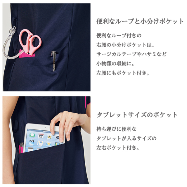 便利なループ付きの右腰の小分けポケットは、サージカルテープやはさみなど小物類の収納に。左腰にもポケット付き。