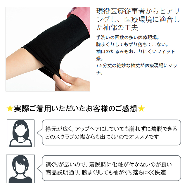 手洗いの多い医療従事者に対して配慮した袖丈。また、袖をめくっても落ちにくいフィット感です。