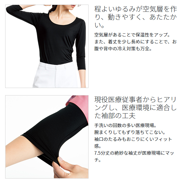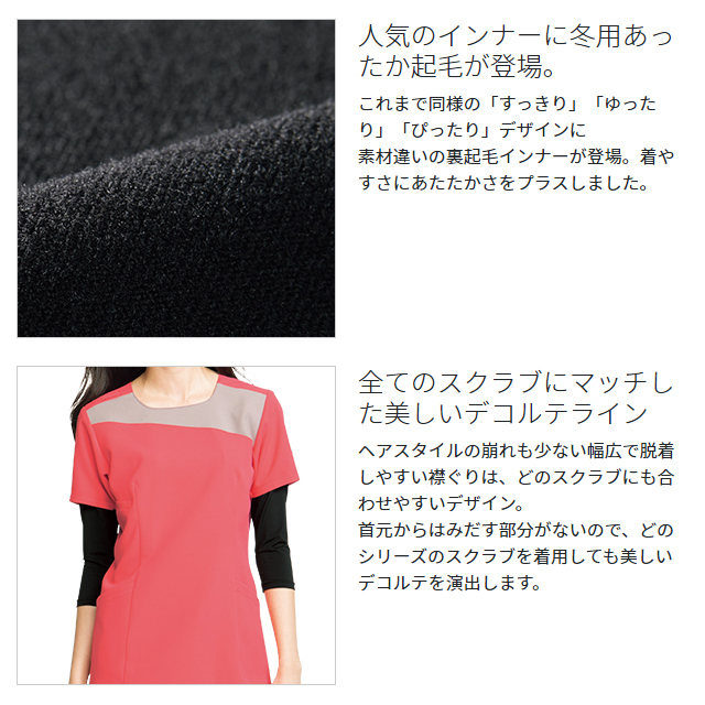 暖かさをアップさせた裏起毛素材で、ポカポカの女性用スクラブインナーTシャツ。一般的なインナーにはない機能を実現させました。身幅は程よいゆるみが空気層を作り、動きやすく、起毛になって更に暖かくなりました。 スクラブにマッチした美しいデコルテラインをデザインしました。医療現場での2年間の取材を繰り返したことで、手洗いや袖をめくる回数も研究し、理想的な袖丈と袖口の強度を実現させました。スクラブ一枚では少し寒さを感じる方におすすめのレディースインナーカットソーです。