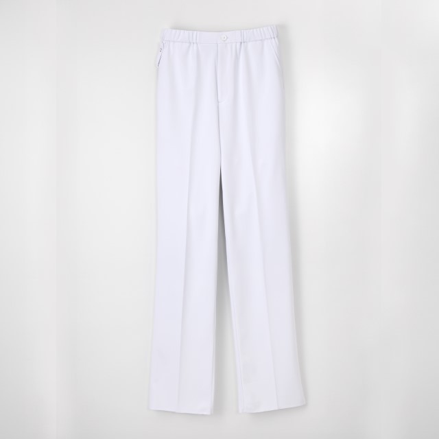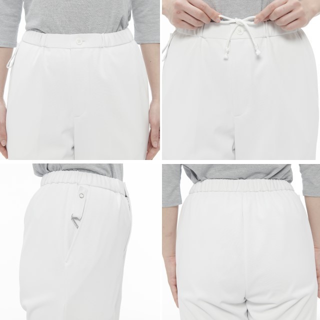 ●特徴:ストレート、ノータック、ウエスト総ゴム、紐付き、前ファスナー、センタープレス有り、両脇ポケット、スナップ付きループ:右腰ポケット口、後ろ裏メッシュ付き