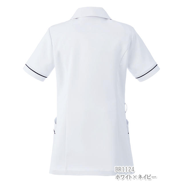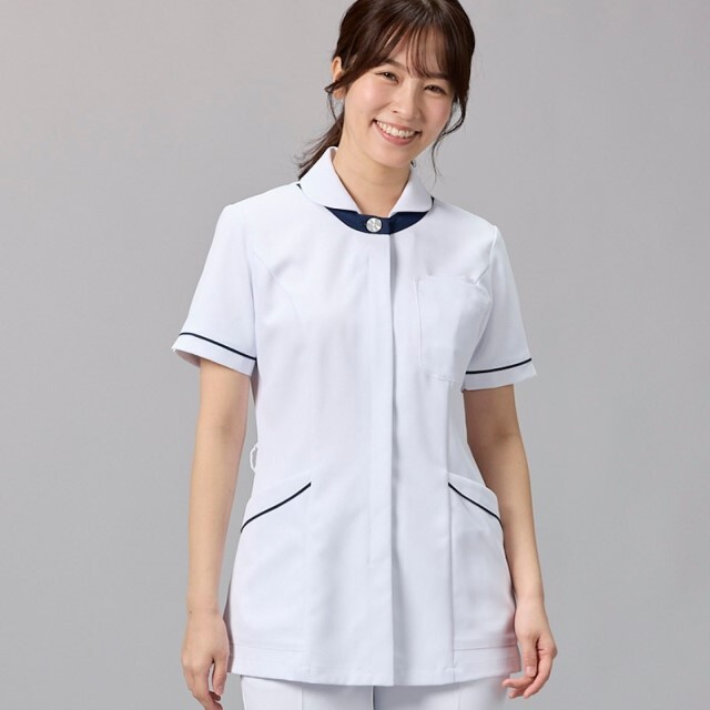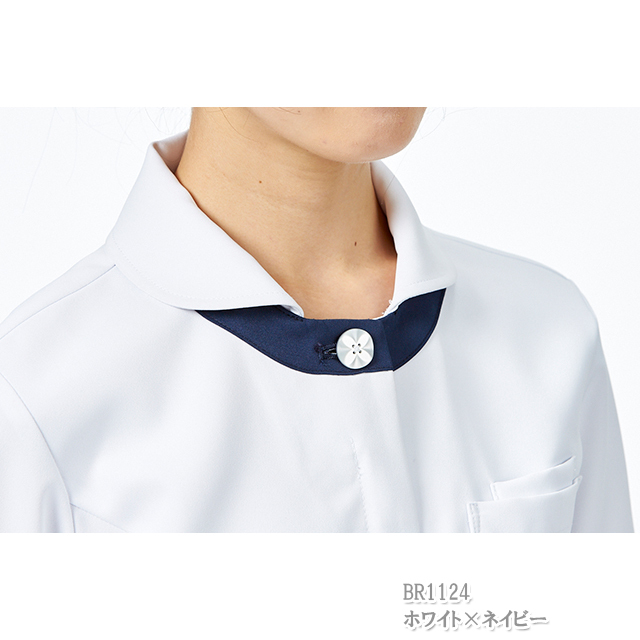 清潔感のある知的スタイルを叶える明るく発色の良いネイビーを使用した白衣。