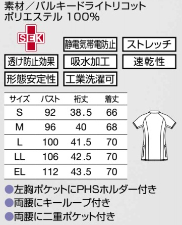 ●機能:制菌加工 静電気帯電防止 ストレッチ 透け防止効果 吸水加工 速乾性 形態安定性 工業洗濯可 二重ポケット