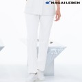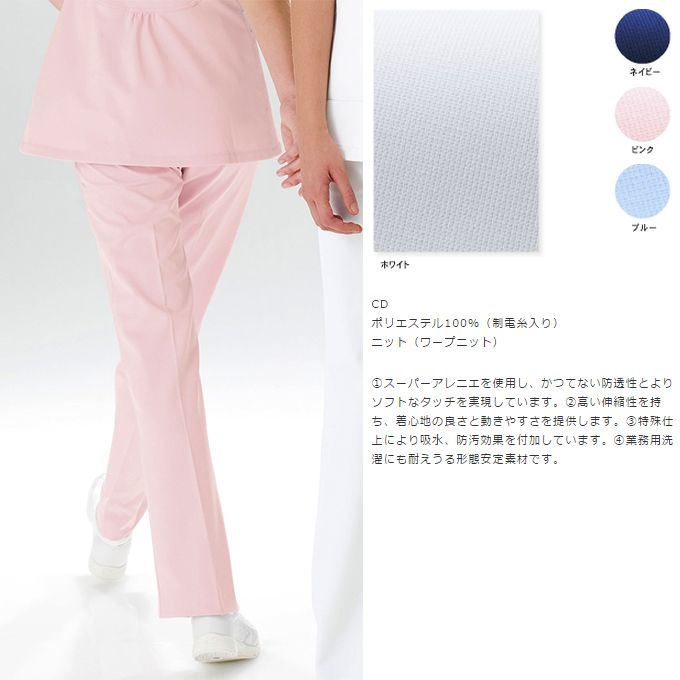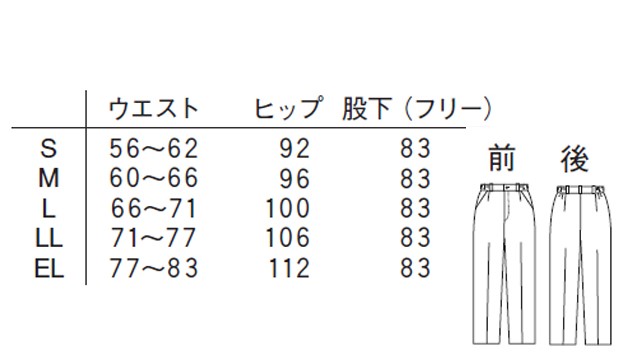 ウエストは両脇ゴム使用でサイズカバーが可能です。かがんでも安心のやや深めの股上設計です。両サイド腰ポケットつきで、適度なゆとりがあるストレートシルエットです。