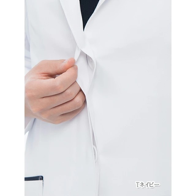 左のラベルに入ったラインがシャープなイメージで信頼感を感じさせます。 比翼仕立てになっているため患者さんにボタンが当たることもありません。すっきりとしたシルエットが洗練された雰囲気です。