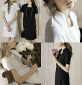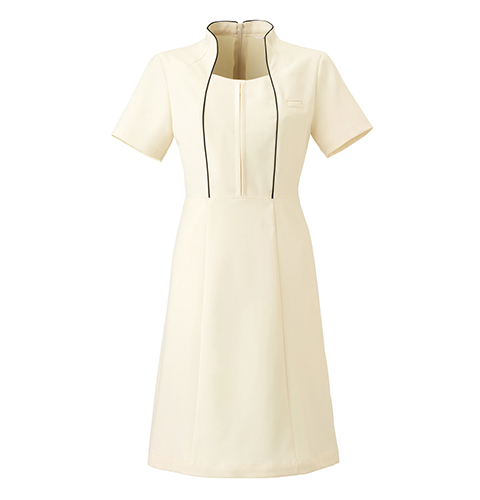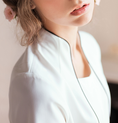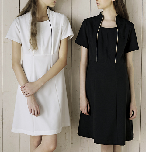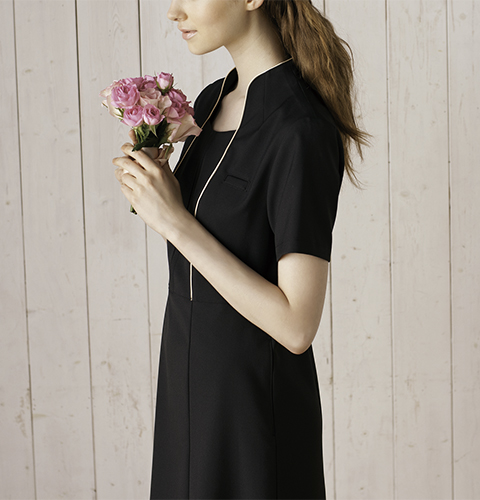 品のある華やかさの中に「ガーリー」をプラスしました。シンプルなデザインの中に、女性らしいデティールをさりげなく取り入れました。クラシカルな装いを思わせる立ち襟が首を長く美しく見せ、縦に使ったパイピングですっきりしたラインを演出します。