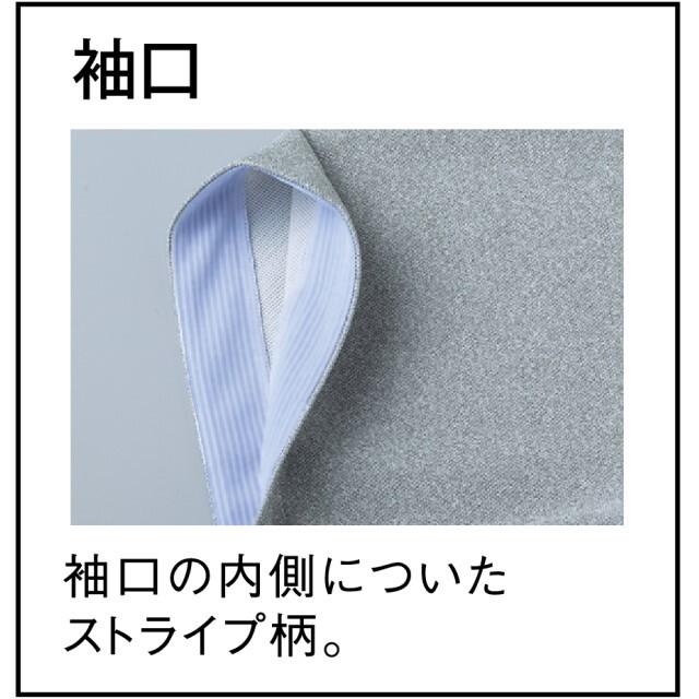 衿元の裏側と袖口にストライプ柄を使用。 ちらりと見えるアクセントが目を引きます。