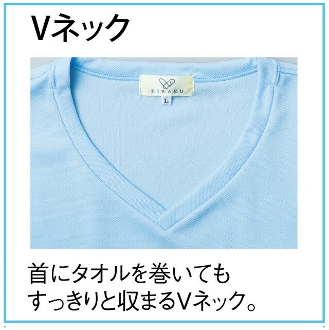 Vネックで首にタオルを巻いてもすっきりと収まります。