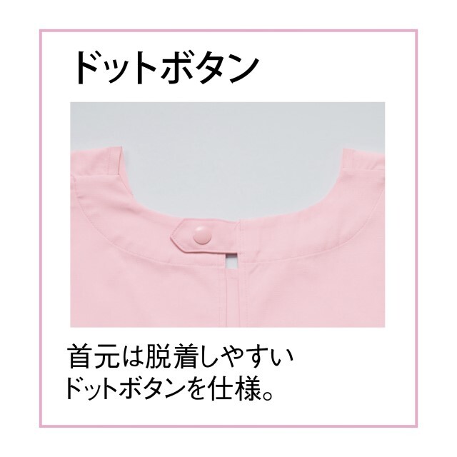首元は着脱しやすいドットボタン仕様。背中はサイズ調節がしやすいひもを採用。