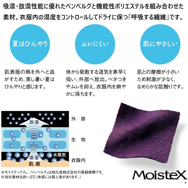 吸放湿性にすぐれ、肌との摩擦が少ないベンベルグ®︎を使用。肌にやさしく、衣服内の湿度をコントロールする「呼吸する繊維」で常に快適に保ちます。