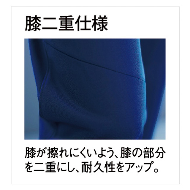 膝が擦れにくいよう、膝の部分を二重にし耐久性をアップ。