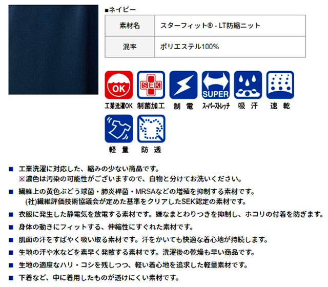(88ネイビー)工業洗濯可 制菌加工 制電 スーパーストレッチ 防縮 吸汗 速乾 軽量 防透