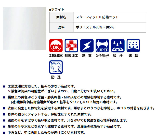 ●機能:(01ホワイト)工業洗濯可 制菌加工 制電 スーパーストレッチ 防縮 吸汗 速乾 防透