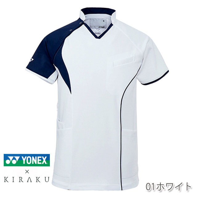 アシンメトリー切替が目を引くすっきりとしたスタンドカラーのスクラブ。