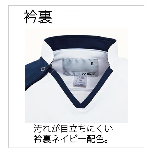 要所のネイビーがデザインを引き締めるとともに、衿裏配色は汚れが目立ちにくい機能的な一面も。