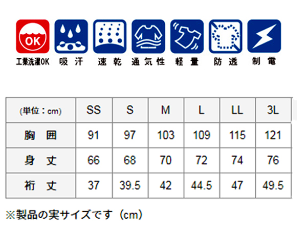 ●機能:工業洗濯可 吸汗 速乾 通気性 軽量 防透 制電