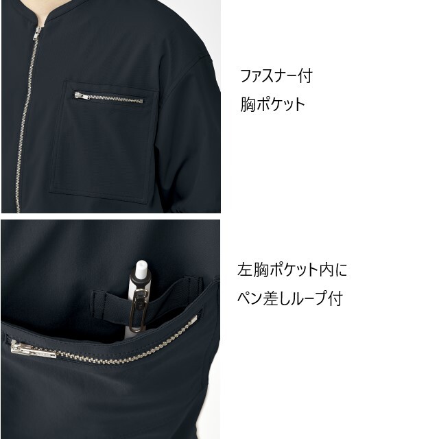 ●仕様:フロントファスナーあき、左胸ポケット(ペン差しループ付)、両脇ポケット、袖口ゴム、裾ゴム