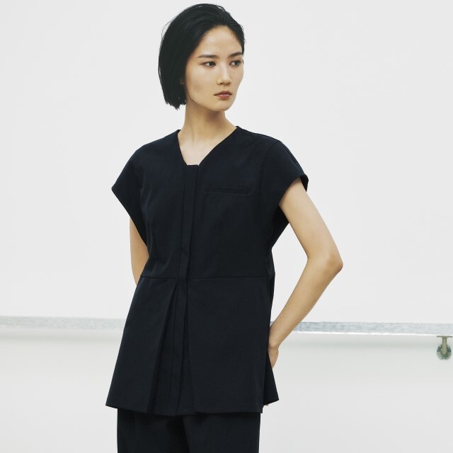 高めの位置でシェイプしたウエストとVネックの効果で、すっきり美しい印象に。