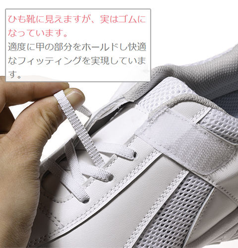 紐靴ひ見えますが、実はゴムになっています。適度に甲の部分をホールドし、快適なフィッティングを実現しています。