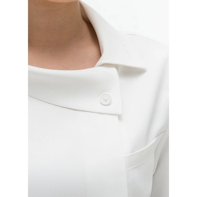 ハードになりがちなツーピーススタイルに人気のロールカラーで優しさを出しています。ロールカラーは、ボタンを留めて首回りをすっきり見せたり、ボタンをはずしてアンバランスな衿型に変えておしゃれを楽しめます。動きが楽なストレッチ素材と、気になる腰廻りをすっぽりとカバーする着丈がより機能的です。