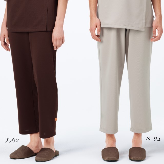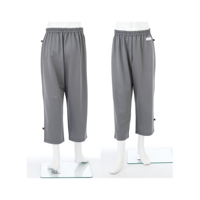 ウエスト総ゴムのゆったりシルエットです。サイズ表示は、脇線に挟んだテープの色で表しています。