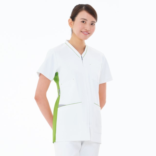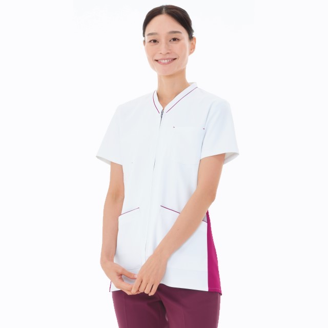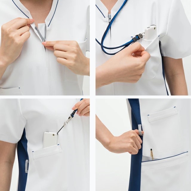 前がファスナー開きの男女兼用スクラブです。ユニバーサルデザインの考え方を取り入れ、すべての機能をカラーで分かりやすくしています。