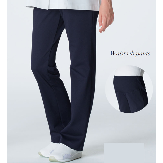 ウエスト上端にサイズ調整できるゴム付きです。おなかの部分にリブ生地を使用、ストレートシルエットです。