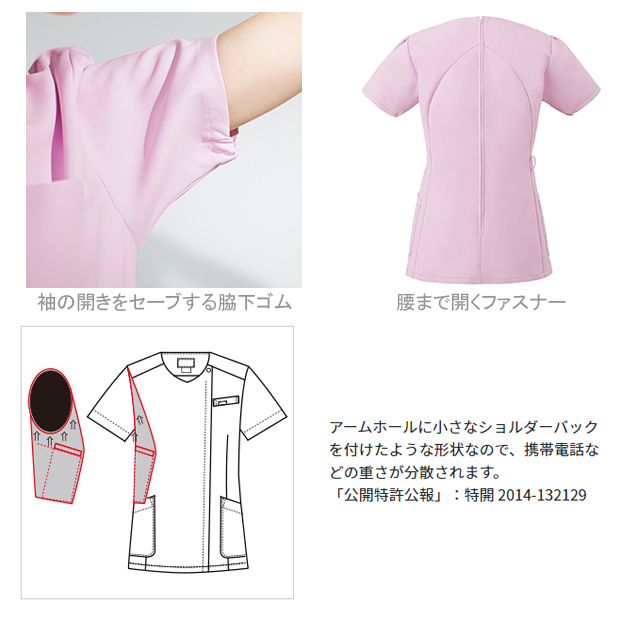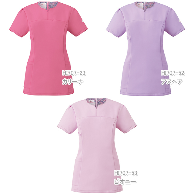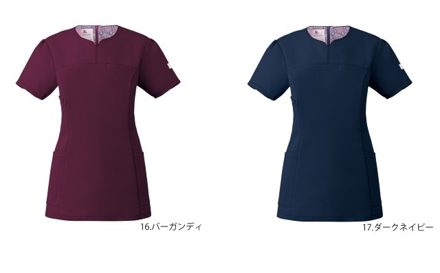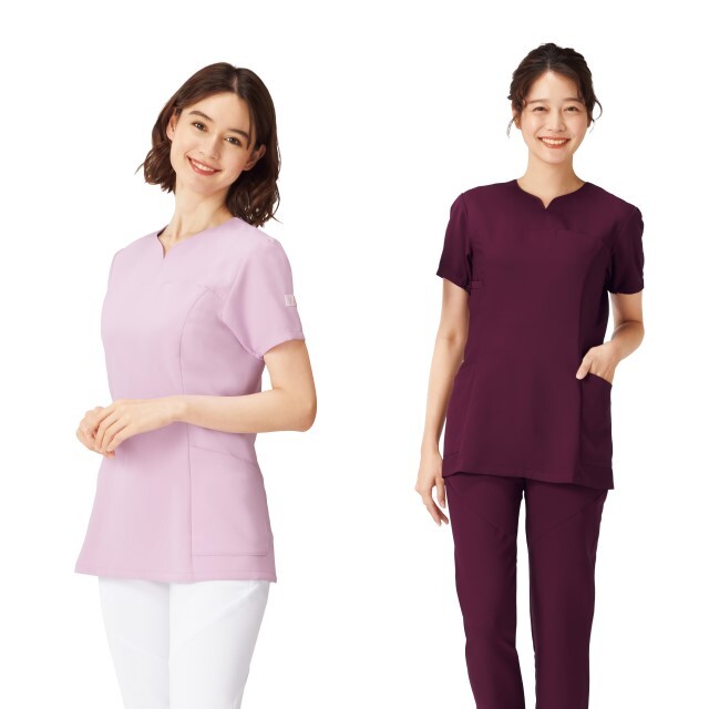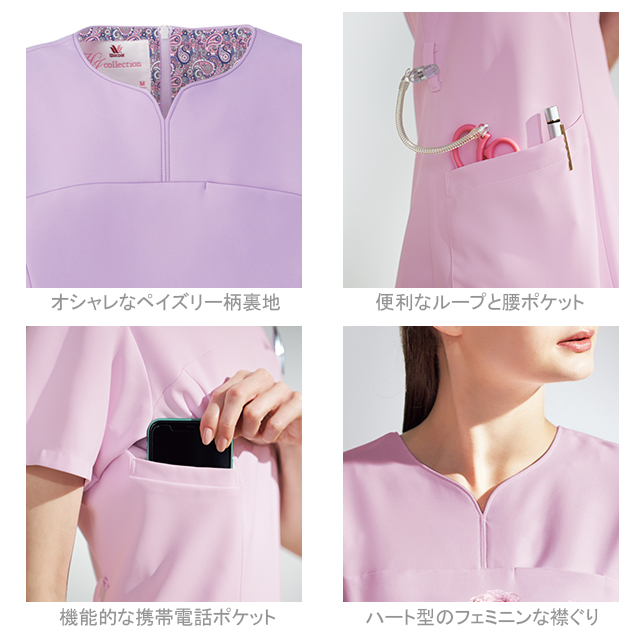 年代問わず女性に高い人気を誇るワコールと、スクラブで業界No.1のフォークの共同開発したワコールHIコレクションシリーズ。 顔まわりをシャープにスッキリと見せてくれるハート型の襟元が特徴の、上品な女性らしいスクラブ。 ワコールのイメージでもある花の色がモチーフとなった、他にはない独特な色合いで、主張しすぎず、優しく淡い印象のカラー展開となっています。 背面の裏地にはペイズリー柄を施し、動いた時や脱いだ時に見える、他と差のつくオシャレなデザインに。 柔らかな風合いが特徴の素材であるネオαは、適度な動きやすさと、ポリエステル100%で、優れたイージーケア性もポイントの一つ。 袖口の下側にはゴムが入っているので、腕を上げた際の袖口の開きを抑えてくれます。 「履いて着る」ことで、髪型の乱れやメイクがついてしまう心配なし!女性に嬉しいスクラブになっています。